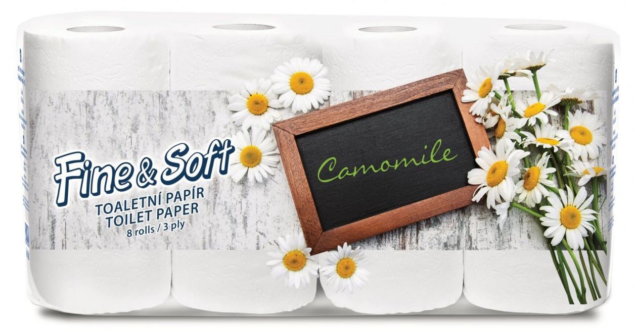 3vrstvý, bílý, toaletní papír s vůní heřmánku, 100 % celulóza, rolička 150 útržků, balení 8 ks