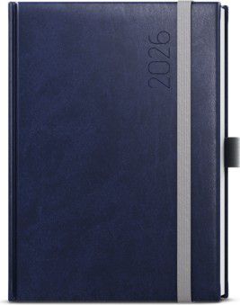 Denní diář v modré barvě z jemné vivelly ve formátu A5 s praktickou gumičkou a poutkem na propisku. Má velký prostor pro poznámky a plánování.