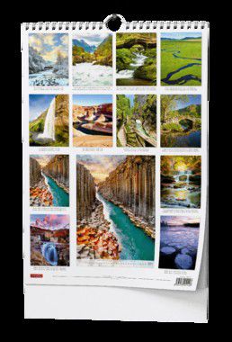 Nástěnný kalendář s obrázky působivých řek a přírodních scenérií.