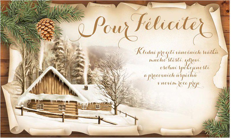 Přání novoroční. V posledních letech se posílají Vánoční přání spíše jako SMS nebo mailem. Tradiční tištěné přání je, ale daleko osobnější a navíc k němu můžete přidat i vlastnoruční podpis. Nezapomeňte poslat krásné Vánoční přání Vašim známým. Určitě je potěší to, že jste si na ně vzpomněli. Text na přední straně: Pour Féliciter Klidné prožití vánočních svátků, mnoho štěstí, zdraví, osobní spokojenosti a pracovních úspěchů v novém roce přeje Papír: pohlednicový karton Přání je baleno v sáčku, součástí balení je i dopisní obálka. Uvedená cena je za 1 ks.