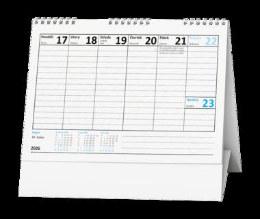Jednoduchý a praktický pracovní kalendář s týdenním kalendáriem v modro-bílé barevné kombinaci.