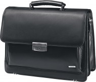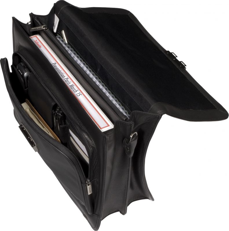 Elegantní aktovka s kovovou sponou vyrobená z kvalitní měkké kůže. Dvě vnitřní prostorné kapsy na dokumenty a dvě vnitřní kapsy na zip. Přední kapsa na zip pro uložení tužek, vizitek a mobilního telefonu. Zadní kapsa na dokumenty. Možnost nošení v ruce či na rameni. Uzamykatelná na klíč. Rozměr: 40 x 30 x 14 cm. Černá barva.