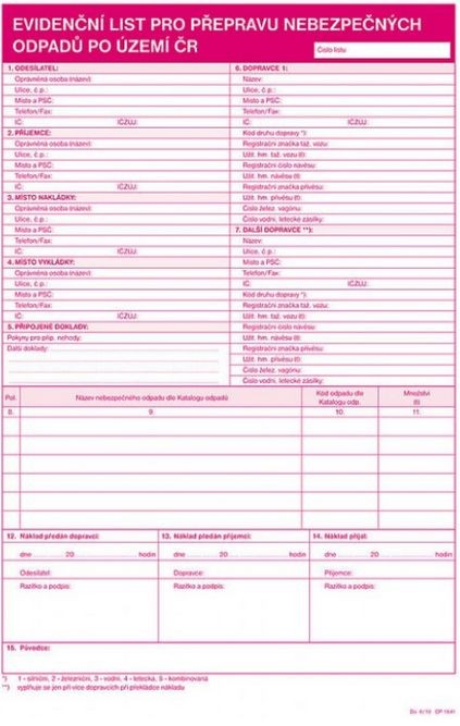 Evidenční list pro přepravu nebezpečných odpadů po území ČR 1+6 kopií