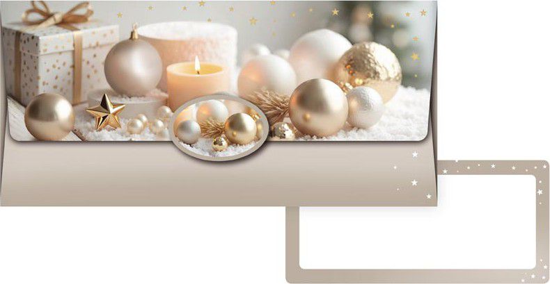Luxusní obálka na peníze ve zlatobílém svátečním stylu Tato elegantní obálka na peníze vnese do vašeho dárku noblesu a slavnostní atmosféru. Kombinace zlatých a perleťových ozdob, jemné světlo svíčky a decentní pozadí vytvářejí harmonický motiv plný klidu, tepla a očekávání. Obálka je ideální pro předání peněz, dárkového poukazu nebo osobního přání během vánočních svátků. Uvnitř obálky se nachází kartička, která je připravena pro vaše osobní sdělení – ať už půjde o přání, poděkování nebo milý vzkaz. I drobný text dodá vašemu dárku výjimečný charakter a zanechá srdečný dojem. Motiv: vánoční Dodáváme v sáčku. Uvedená cena je za 1 ks.