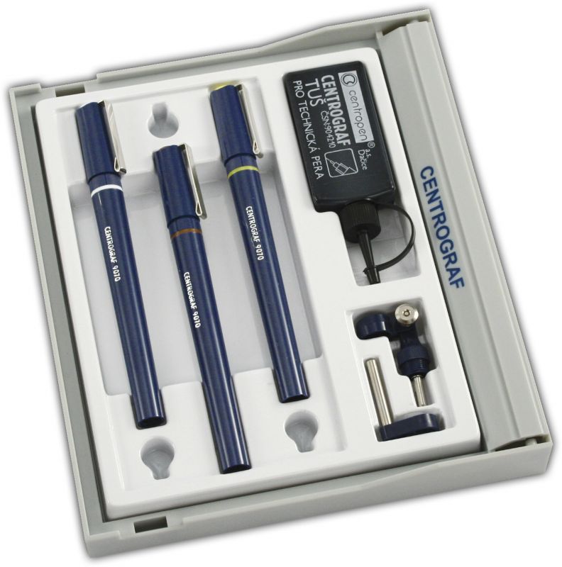 Tech. pera 0,25, 0,35, 0,5 mm. Tuš, nástavce do kružítka. Odpovídá normám ISO, DIN a ČSN.