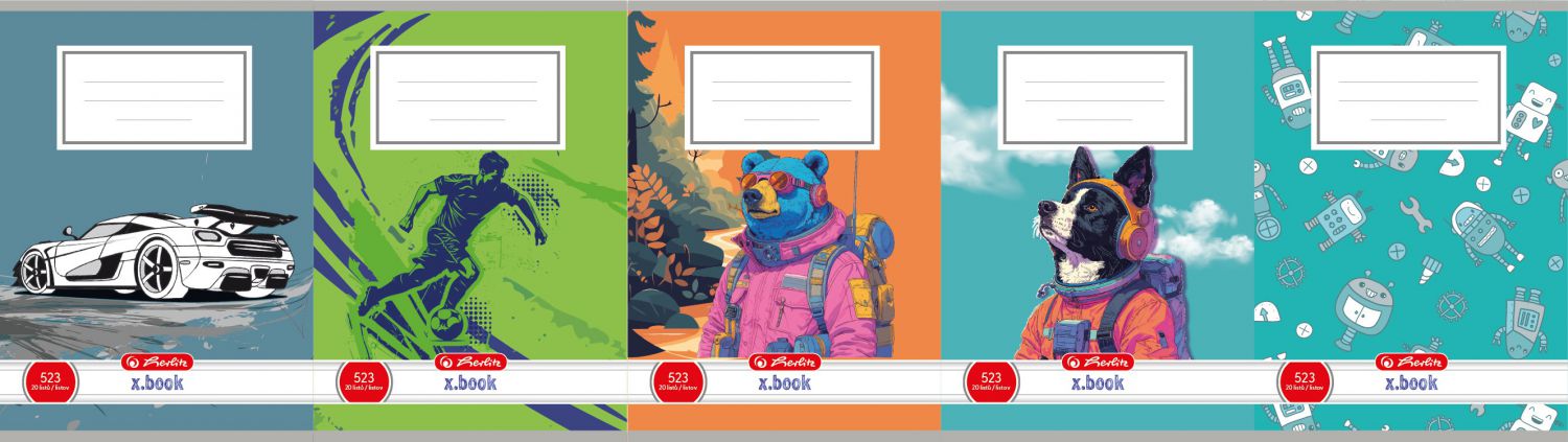- Sešit nabízí motivy robotů, psa, medvěda, fotbalisty nebo auta, které dodávají zápiskům zábavný a dynamický vzhled.