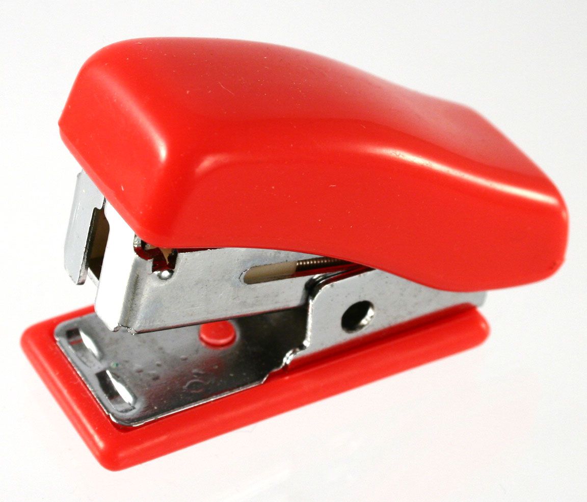 Malý model sešívačky, jehly 24/6. Délka vkládání 18 mm. Rozměry: délka 55 mm, výška 40 mm.