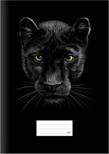 - Školní sešit bez linek ve formátu A4, v černé barvě, s motivem černého pantera, v originálních deskách s matným laminem a lokálním UV lakem.