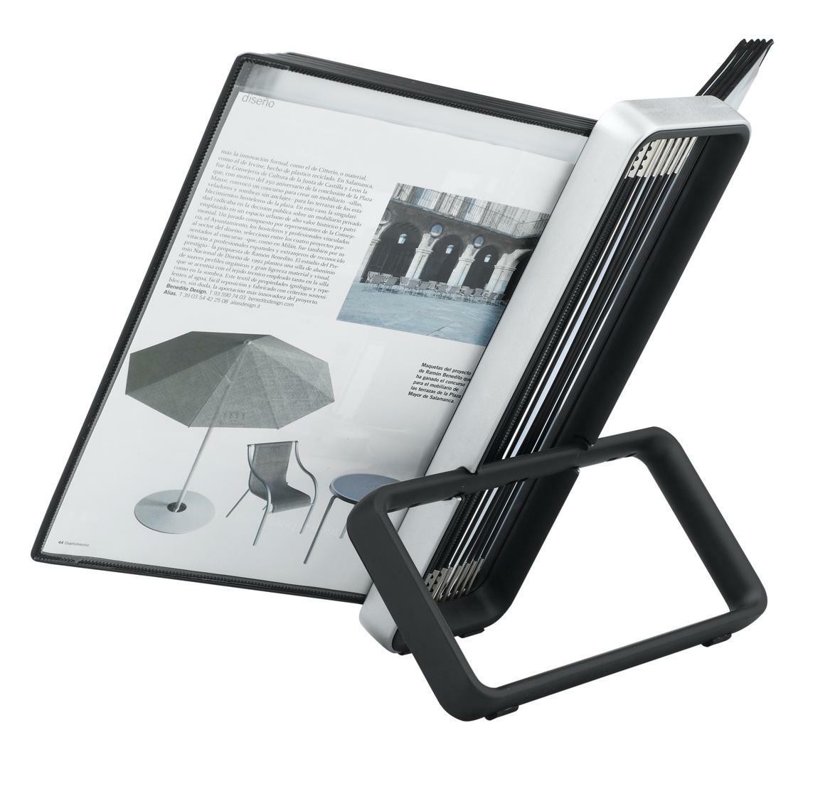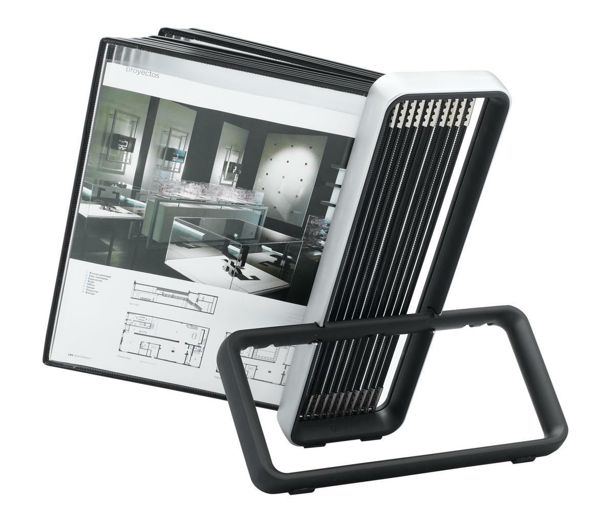 VEO pultový stojan s velmi stabilní kovovou konstrukcí v zajímavém minimalistickém designu. Jednoduché vložení a vyjmutí kapes pomocí úchytů. Dodáván včetně 10 černých kapes formátu A4. Kapsy s úchyty jsou vyrobeny z ekologicky šetrného polypropylenu. Rámeček je uvnitř vyztužen ocelovým drátem, kapsa je pružná a tvarově stabilní. Držák lze umístit na pulty, stoly reprezentativních míst. Podstavec vybaven protiskluzovými podložkami. Barva displeje i rámečků: černá.