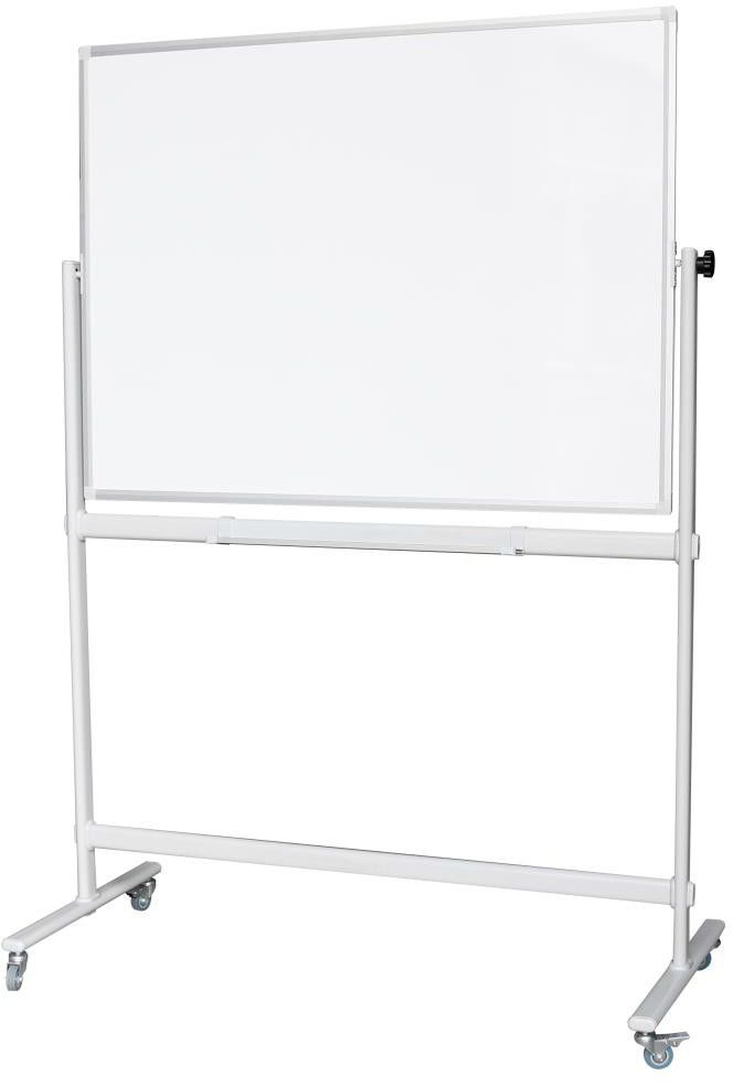- Oboustranná tabule na mobilním stojanu se čtyřmi pojezdovými kolečky a aretací je horizontálně otočná a vhodná pro kanceláře.