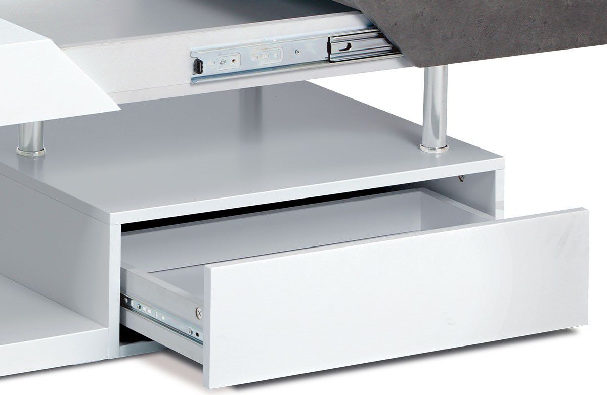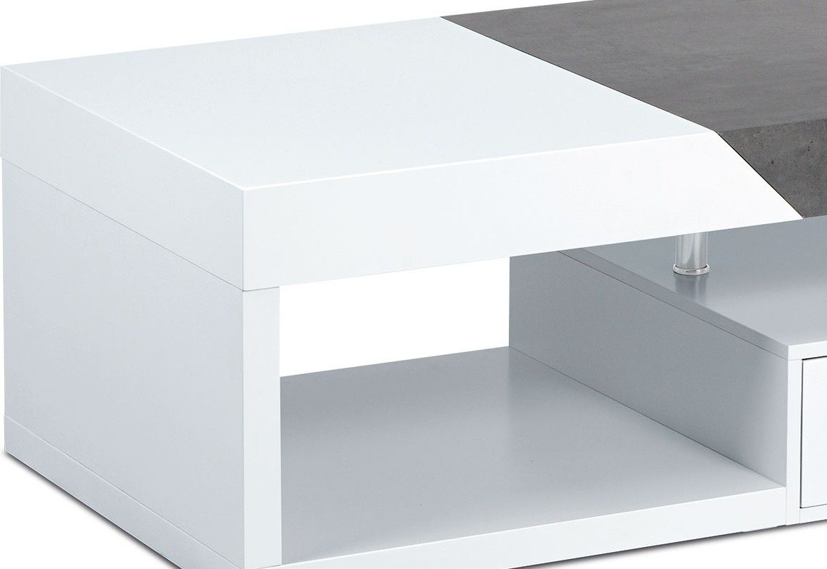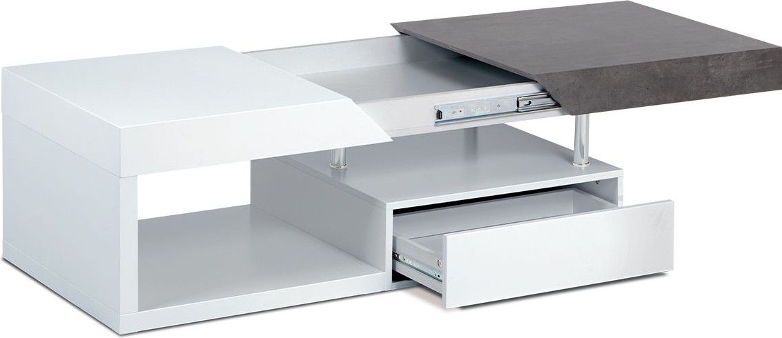 Moderní konferenční stolek v bílém matu, který je nejen velice pohledný, ale také opravdu praktický. Vrchní deska lze roztáhnout do šíře až 165 cm, díky čemuž se otevře úložný prostor pod deskou s vnitřním rozměrem 63x51x6,5 cm. Odsunout lze polovinu v dekoru betonu. Vrchní část je na třech kovových vzpěrách s chromovou úpravou. Stolek má také jeden výsuvný šuplík ve spodní části, který se stisknutím hladce otevře. Vnitřní rozměr šuplíku je 51x33x11 cm. Další úložný prostor je zajištěn pomocí dvou přihrádek pod vrchní deskou.