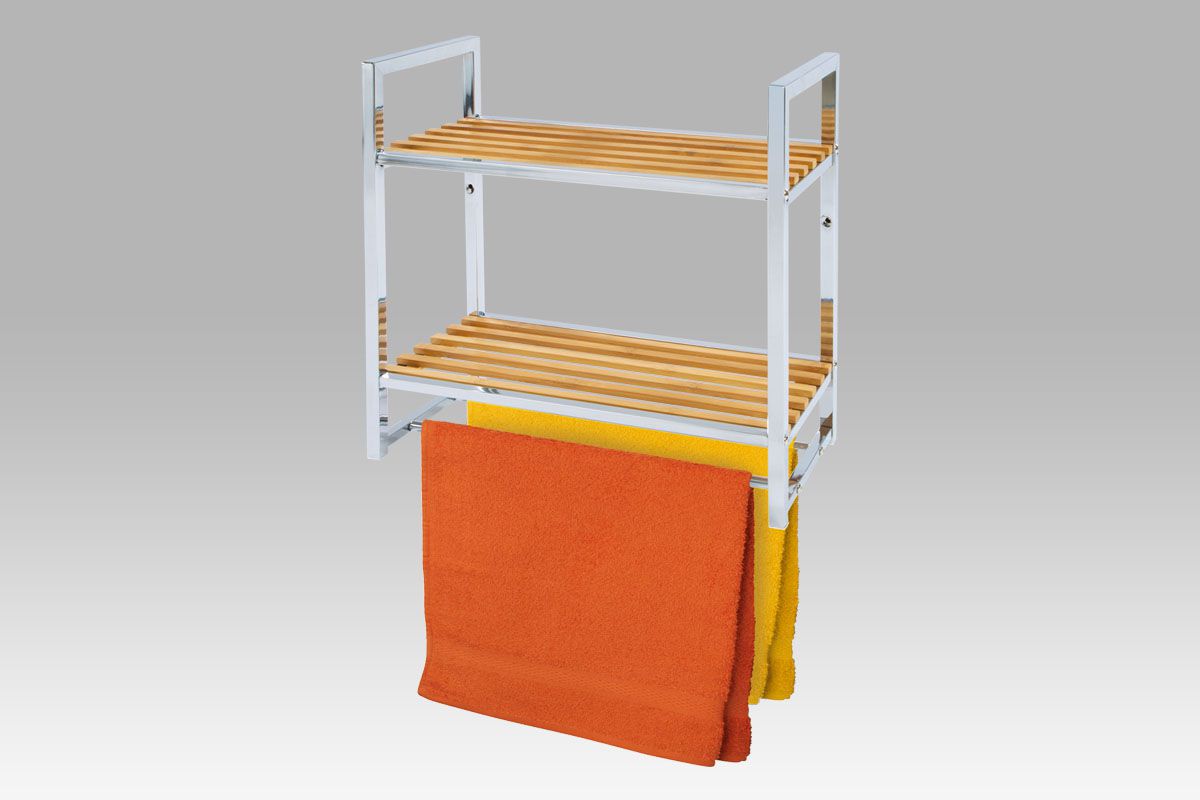 Závěsný 2-policový regál s držáky na ručníky vyrobený z bambusových latí v přírodním odstínu v kombinaci s chromem.