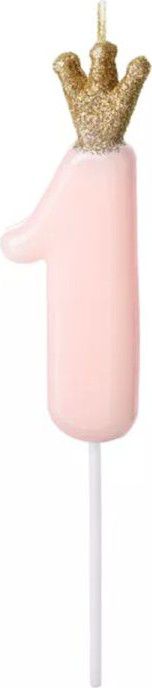 - Růžová dortová svíčka ve tvaru číslice se zlatou, glitrovou korunkou.
