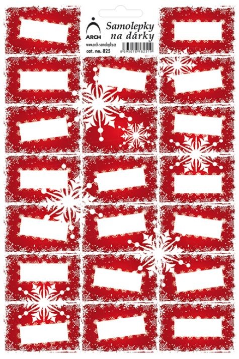 - Červené vánoční etikety s vločkami na dárky pod stromečkem.