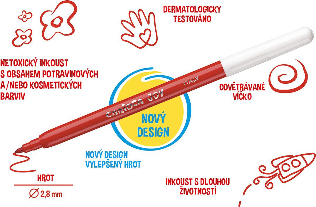Kvalitní fixy se středně silným hrotem. Kulatý tvar těla pro snadné držení dětí. Vhodné na běžné kreslení, do škol nebo výtvarných kroužků. Nevhodné pro děti do 3 let.