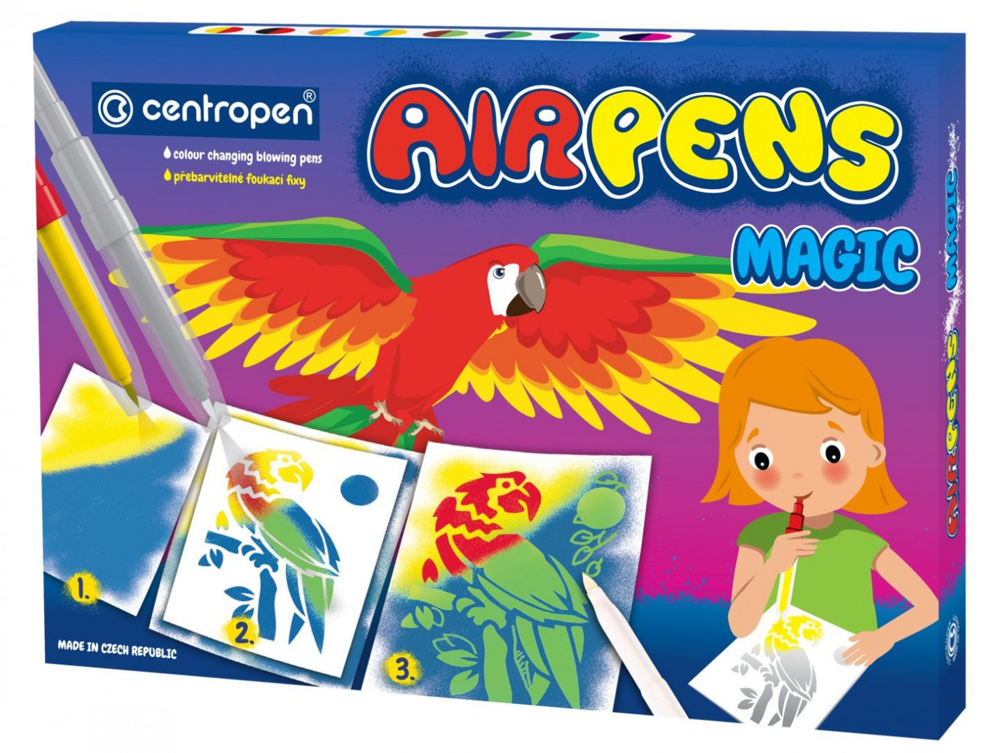 Magické foukací fixy na papír. Inkousty přebarvitelné zmizíkem a zcela zdravotně nezávadné. Sada obsahuje 8 barevných odstínů foukacích fixů, 2 foukací a 1 klasický zmizík, 4+2 šablony, 10 archů A4.
