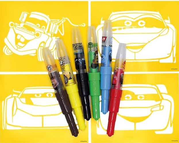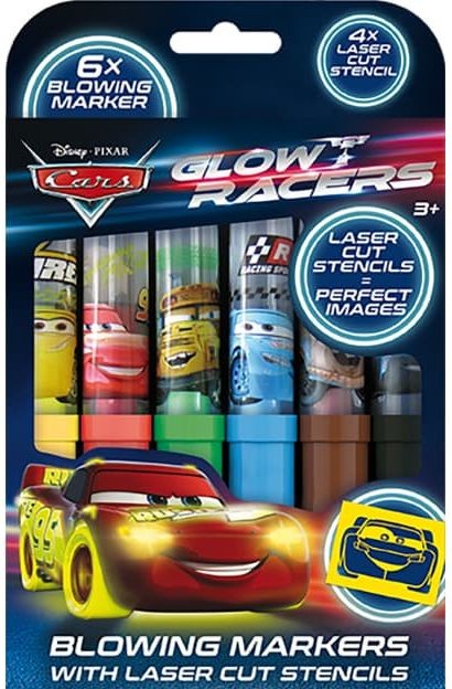 Balení obsahuje 6 barevných foukacích fixů s potiskem a 4 barevné papírové šablonky v oblíbených pohádkových motivech.