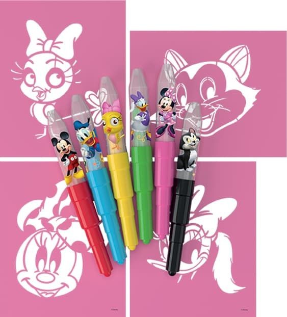 - Balení obsahuje 6 barevných foukacích fixů s potiskem a 4 barevné papírové šablonky v oblíbených pohádkových motivech.