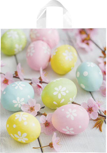 - Tato velikonoční igelitová taška s jarním motivem vajíček a květů je praktickým pomocníkem pro pohodlné přenášení nákupu nebo větší výslužky.