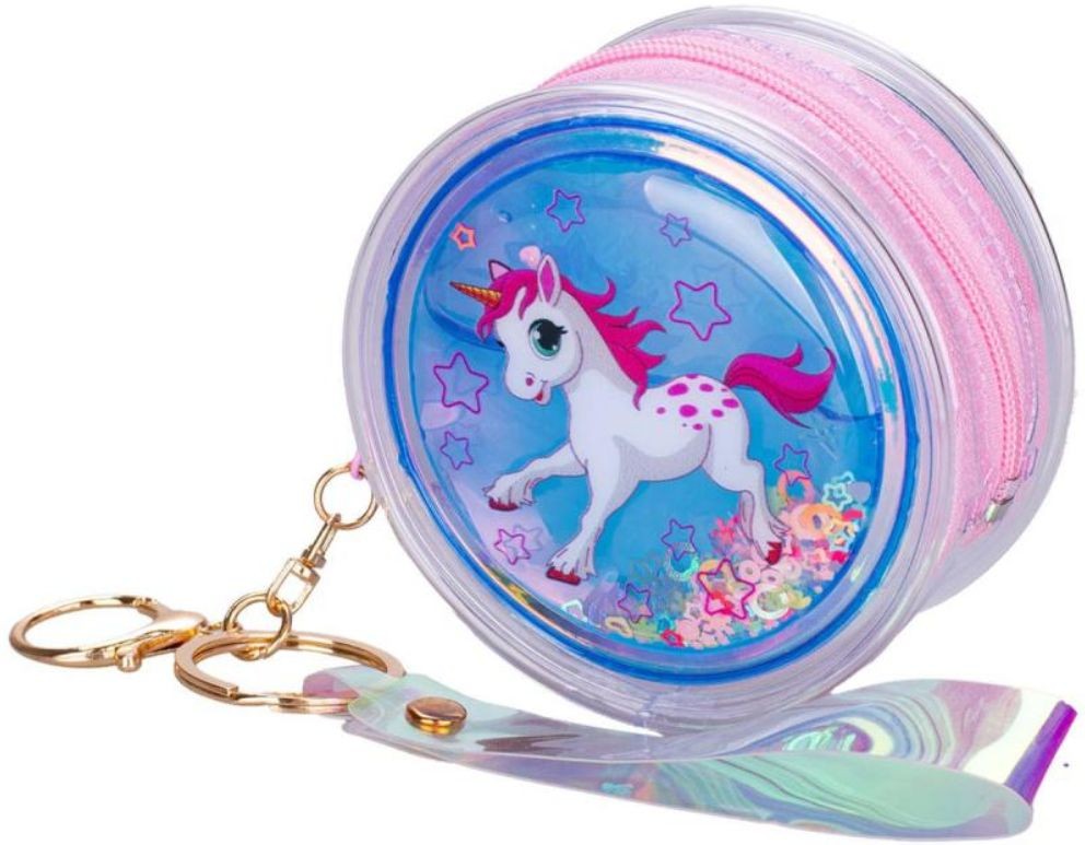 - Originální průhledná kulatá plastová mini dívčí kabelka / klíčenka s motivem Jednorožec, se zapínáním na zip, se třpytkami v tekutině.
