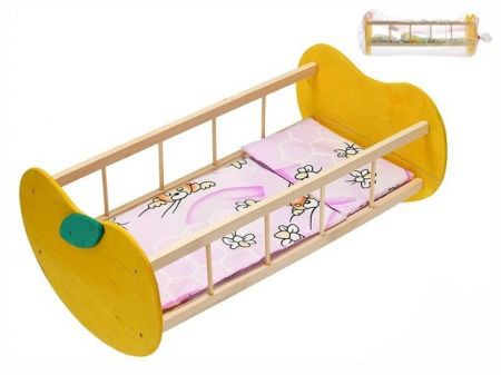 Dřevěná kolébka pro panenky o rozměrech 51x30x19cm nesmí chybět žádné malé mamince. Součástí je i polštářek a příkrývka.