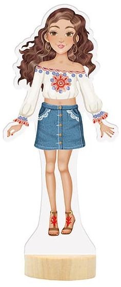 - Balení obsahuje oblékací postavičku, 3 archy magnetických částí oblečení, bot a doplňků a dřevěný podstavec.