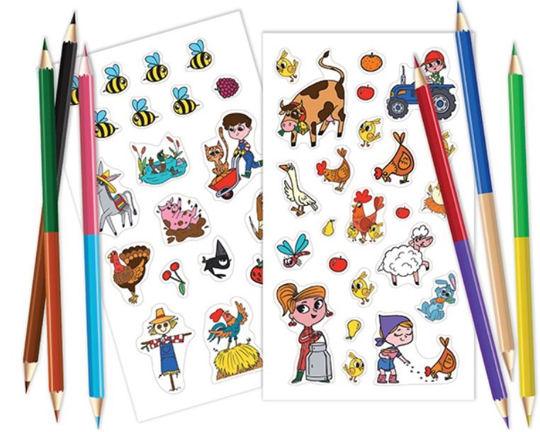 - Omalovánky obsahují 96 stran nejrůznějších aktivit, 2 listy samolepek a 6 oboustranných pastelek.