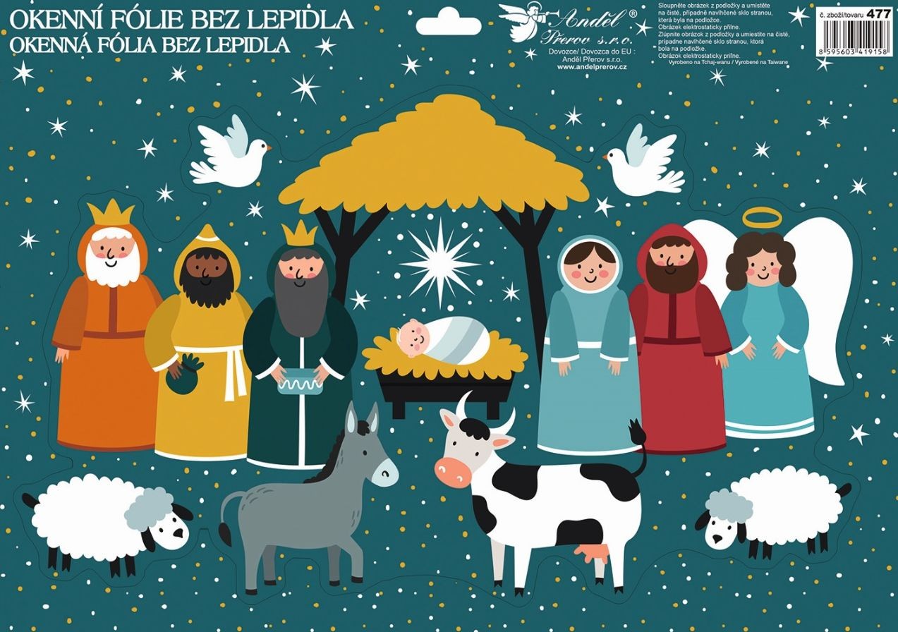 Fólie s tradičním betlémským motivem o rozměru 42 × 26 cm zachycuje biblickou scénu v živých barvách. Transparentní provedení propouští světlo a zároveň zvýrazňuje kontury motivu. Díky elektrostatickému přilnutí se fólie snadno aplikuje a lze ji opakovaně používat.
