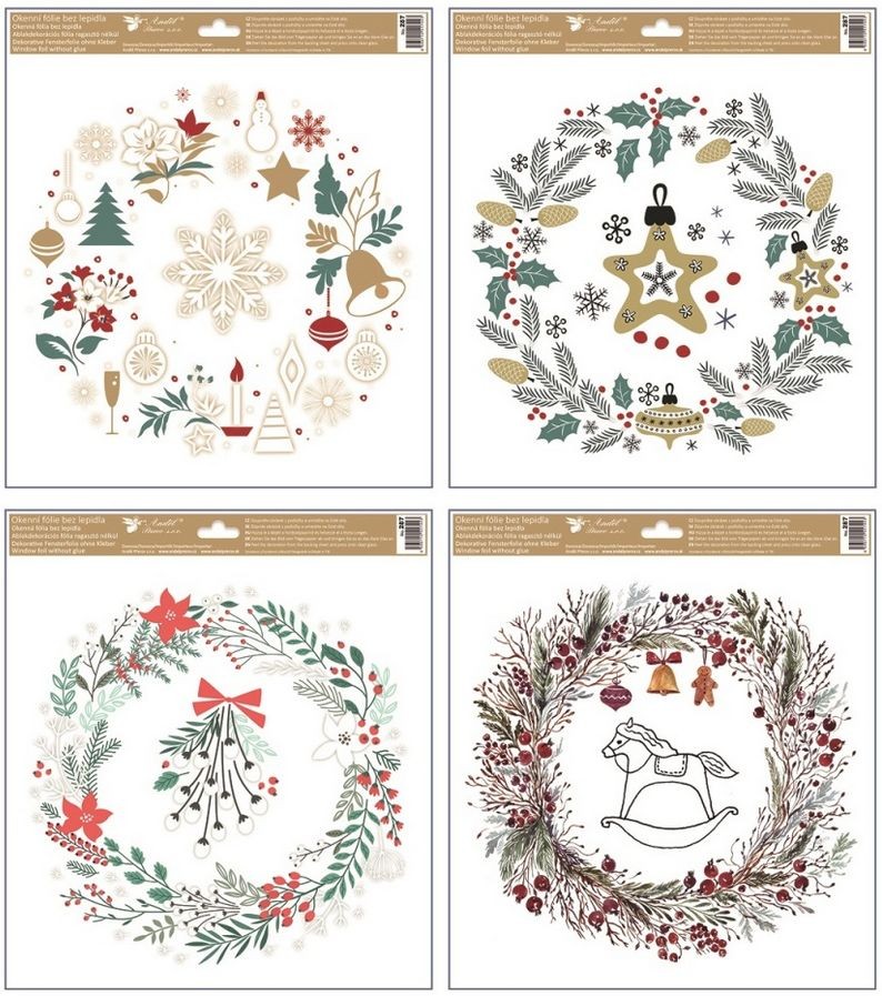 Okenní fólie s glitry barevné Vánoční věnce 30×33,5 cm, 4druhy