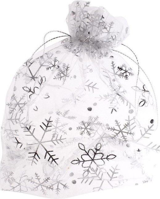 - Vánoční dárkový sáček z organzy se stříbrným potiskem vloček.