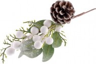 Umělá dekorační přízdoba ze zasněžené větvičky túje s šiškou a bílými bobulemi. Bude pěknou ozdobou do váz, truhlíků a jako přízdoba k jiným dekoracím. Větvička má uvnitř ohebný drátek. Můžete si ji tak vytvarovat podle svých představ. Délka: 24 cm Cena je uvedena za 1 kus.