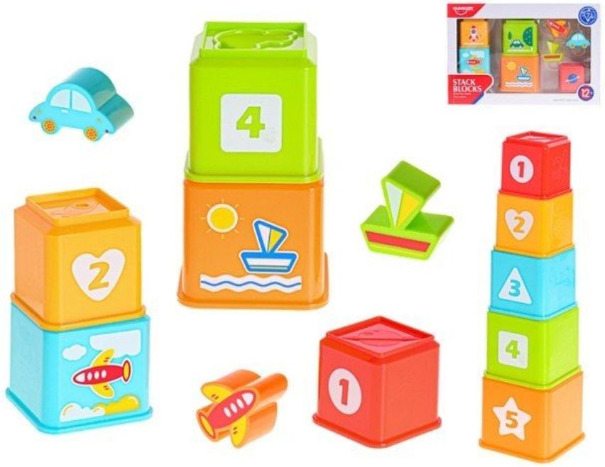 - Balení obsahuje 5 skládacích kostek a 3 vkládačky.