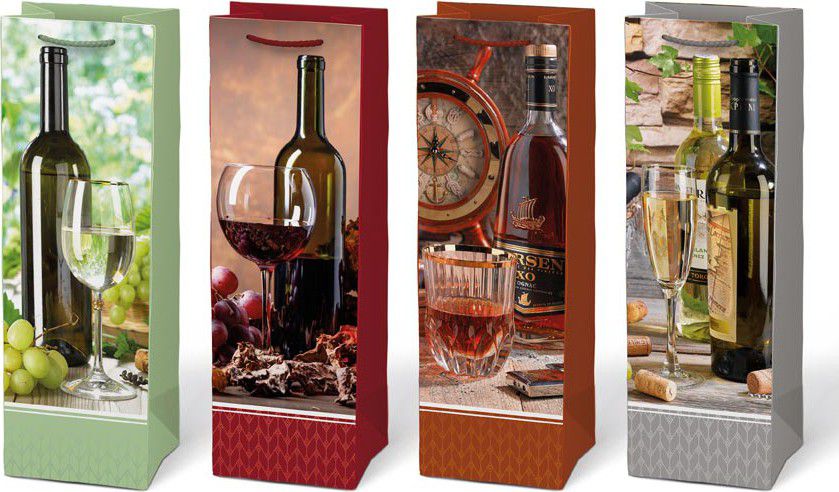 Dárková papírová taška T12 v mixu motivů, každý s elegantním a atraktivním designem. Je vhodná pro různé druhy lahví, nejen pro víno. Lze ji použít i pro likéry, oleje, nebo jiné nápoje v lahvích. Tato stylová taška je opatřena pevným uchem pro snadné a pohodlné nošení. Použití dárkové tašky eliminuje potřebu složitého balení. Darujte lahev originálně a elegantně.