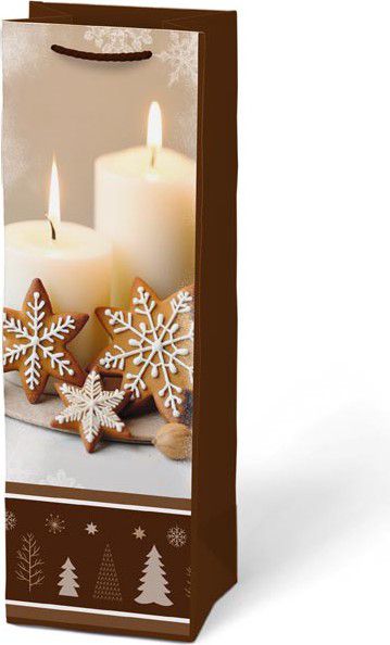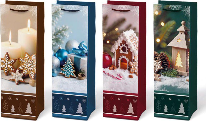 Darovat lahev vína, sektu nebo domácího punče nebylo nikdy snazší. Papírová dárková vánoční taška MFP T12 má úzký a vysoký tvar, který je přímo stvořený pro balení lahví. Stačí vložit, předat – a o sváteční atmosféru se postará krásný vánoční motiv. Kolekce nabízí mix elegantních designů – od hřejivých svíček přes perníčky a chaloupku až po ozdobené větvičky. Pevný papír a odolná šňůrková ucha zajistí, že dárek bezpečně dorazí k obdarovanému.