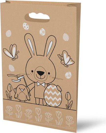 Velikonoční papírová taška s potiskem zajíčka, kuřete a kraslice. Ideální pro vytváření čokoládových balíčků pro děti!