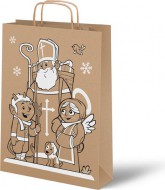Dárková papírová taška s průhmatem a potiskem Mikuláše, anděla a čerta.