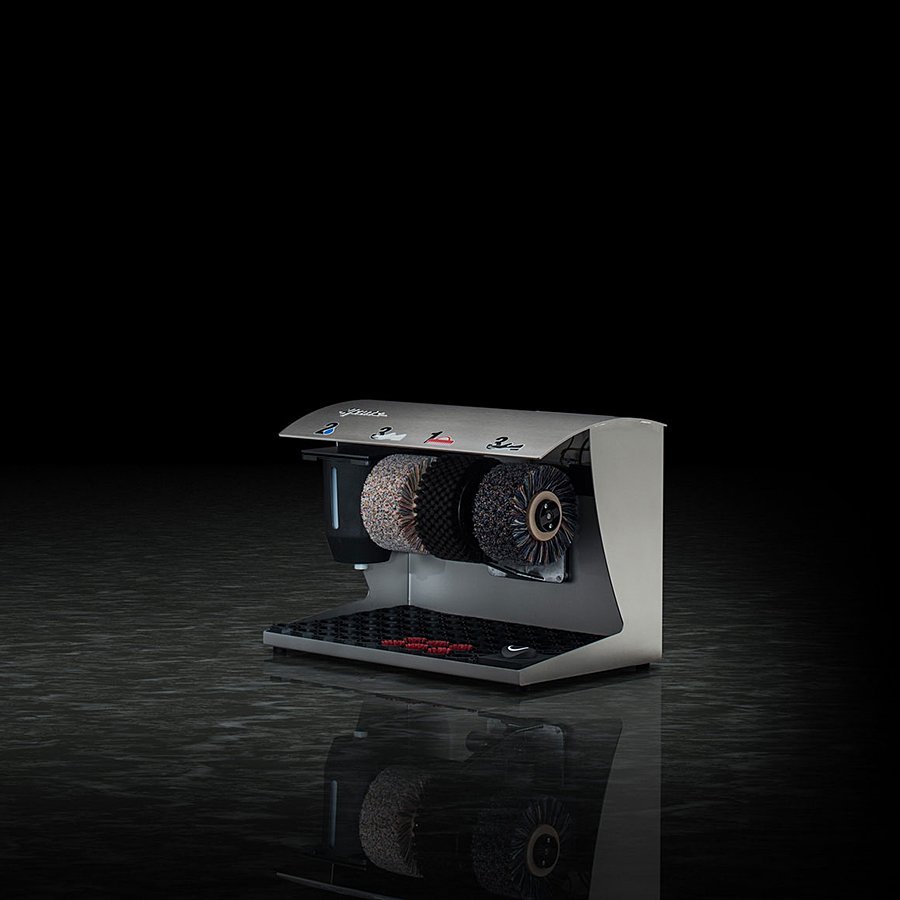 Stříbrný (nerezový) čistič obuvi Elegance Color je menší a kompaktní čistič, který je určen především do menších hotelů, penzionů, bank, restaurací, barů, obchodů, heren a kanceláří. Jedná se o menší kompaktní čistič se třemi kartáči a nádržkou na polituru. Čistič na boty Elegance Color je vybaven nožním senzorem s časovačem.