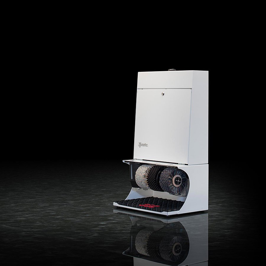 Bílý čistič obuvi Ronda 30 nabízí neotřelý design, díky kterému se skvěle hodí do menších hotelů, penzionů a kancelářských prostor. Jedná se o výkonný čistič menších rozměrů se třemi kartáči a nádržkou na polituru. Čistič na boty Ronda 30 je vybaven ručním senzorem s časovačem umístěným na horním víku čističe.