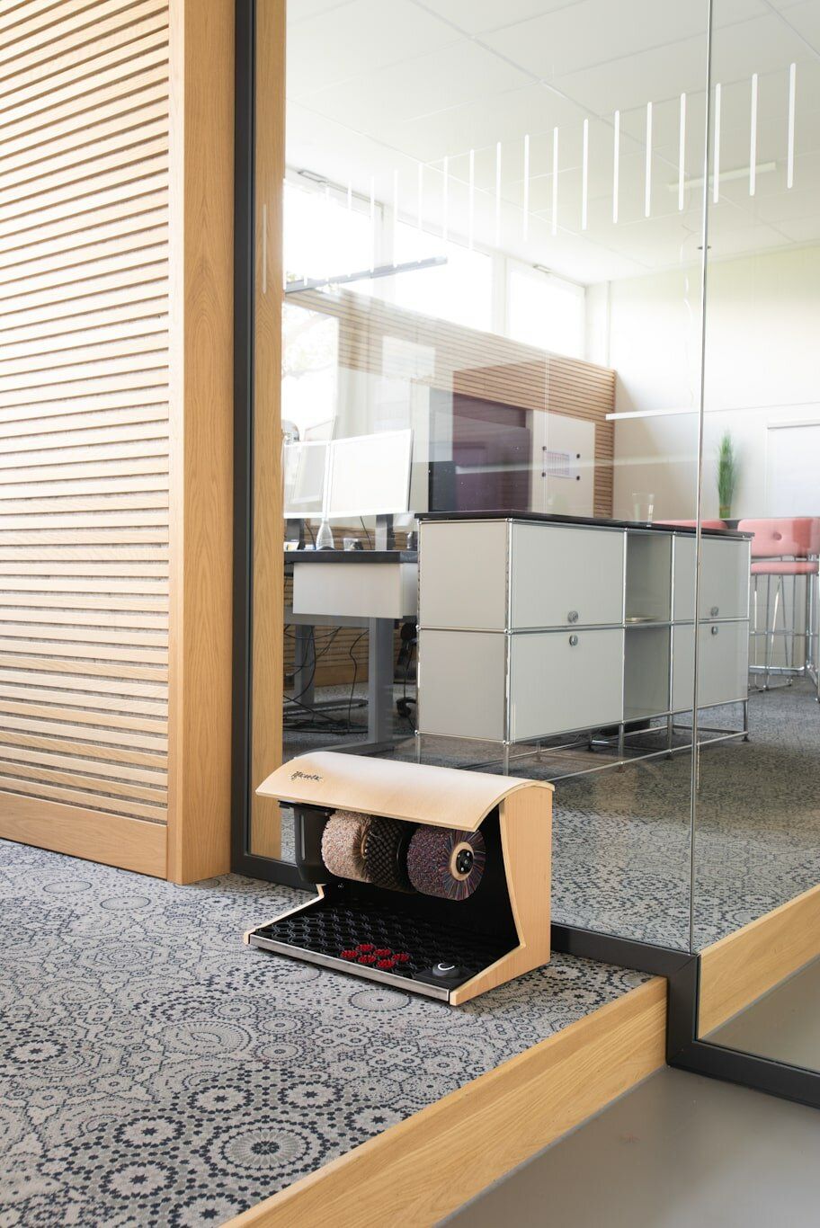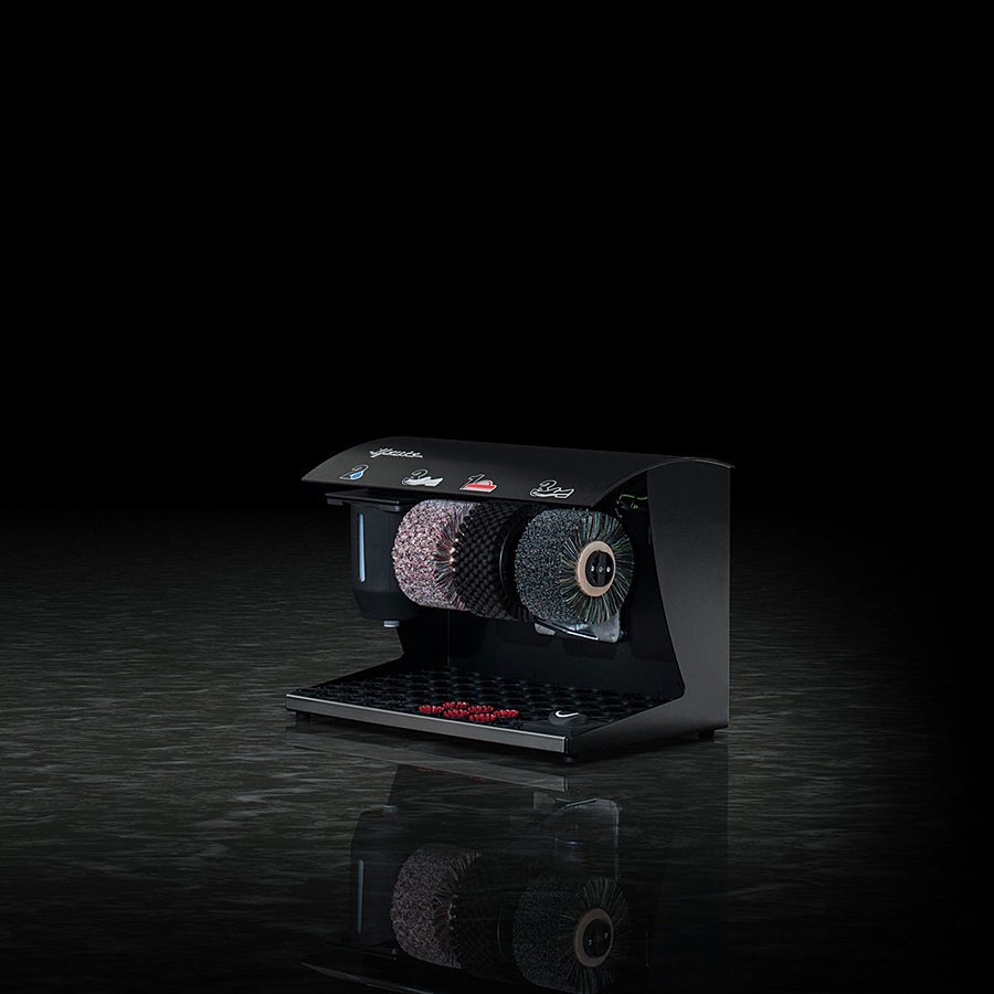 Čistič obuvi Elegance Color má jeden čistící, dva leštící kartáče a nádržku na polituru. Jedná se kompaktní a elegantní čistič bot, který je dodáván v několika barevných kombinacích. Okartáčovaná nečistota padá do vyjímatelné gumové rohože, která je osazena kartáčky na čištění podrážek bot.