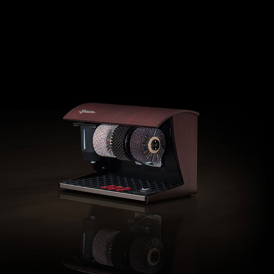 Dřevěný (mahagon) čistič obuvi Elegance Nature je elegantní a kompaktní čistič obuvi, který je vyroben ze skutečného dřeva. Toto elegantní řešení se uplatní především do menších hotelů, penzionů, bank, restaurací, barů, obchodů, heren a kanceláří, ve kterých jdou elagance a přírodní materiály ruku v ruce. Jedná se o menší kompaktní čistič se třemi kartáči a nádržkou na polituru. Čistič na boty Elegance Nature je vybaven nožním senzorem s časovačem.