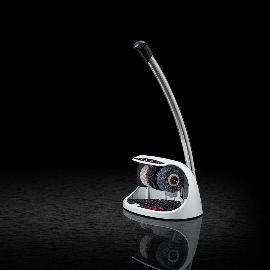 Bílý čistič obuvi Cosmo plus je elegantní a kompaktní čistič obuvi, který najde uplatnění především v menších hotelích, penzionech a v místech, kde není tak rušný pohyb osob, jako ve velkých komplexech a budovách. Jedná se o kompaktní čistič se třemi kartáči a nádržkou na polituru. Čistič na boty Cosmo plus je vybaven ergonomickou rukojetí v jejímž zakončení je integrován ruční spínač s časovačem.