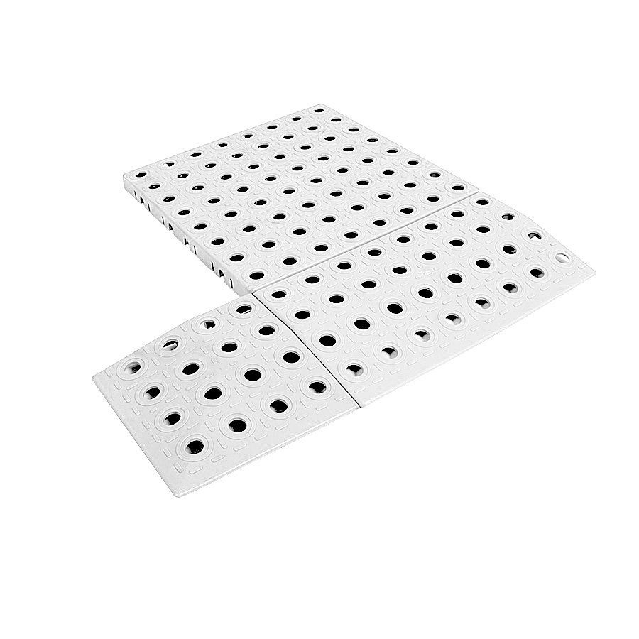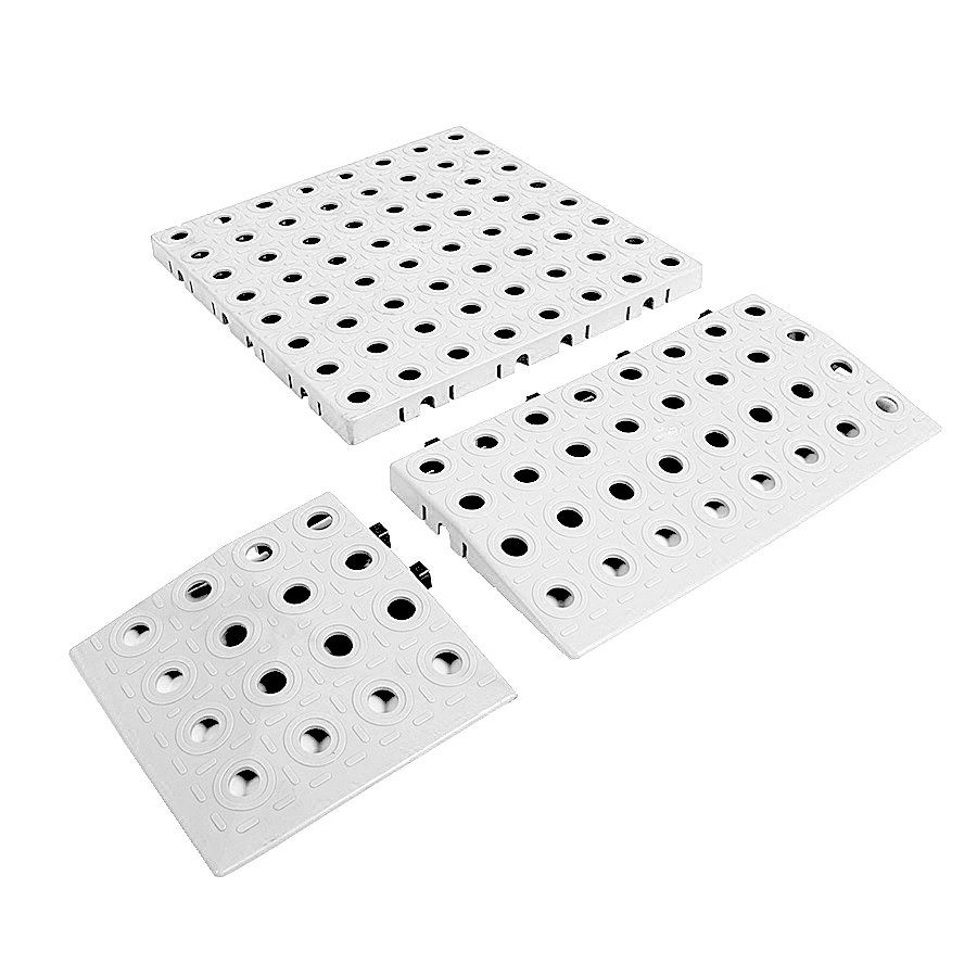 Základním prvkem systému je deska 250x250 mm a pro vytvoření nájezdových hran se využívají rovné a rohové nájezdy. Jednotlivé díly systému se spojují plastovými spojkami, které jsou v příslušném počtu u každého modulu zahrnuty v ceně. Provedení povrchu všech dílů je protiskluzové s otvory o průměru 12 mm, výška desek je 16 mm.