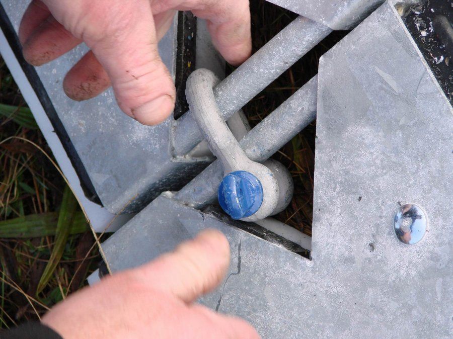Rohy pontonové desky jsou osazeny manipulačními a spojovacími úchyty z kovu. Spojit je lze závěsnými oky ve tvaru Omega viz foto. Oka se dodavají automaticky k desce a to v počtu, aby se daly desky spojit navzájem, počet dodavaných závěsných ok se odvíjí od počtu objednaných desek a dle preferovanému napojení desek na sebe. Závěsné oka jsou v ceně desky. Ideálně specifikujte do poznámky v objednávce či konzultujte s naší zákaznickou podporou.