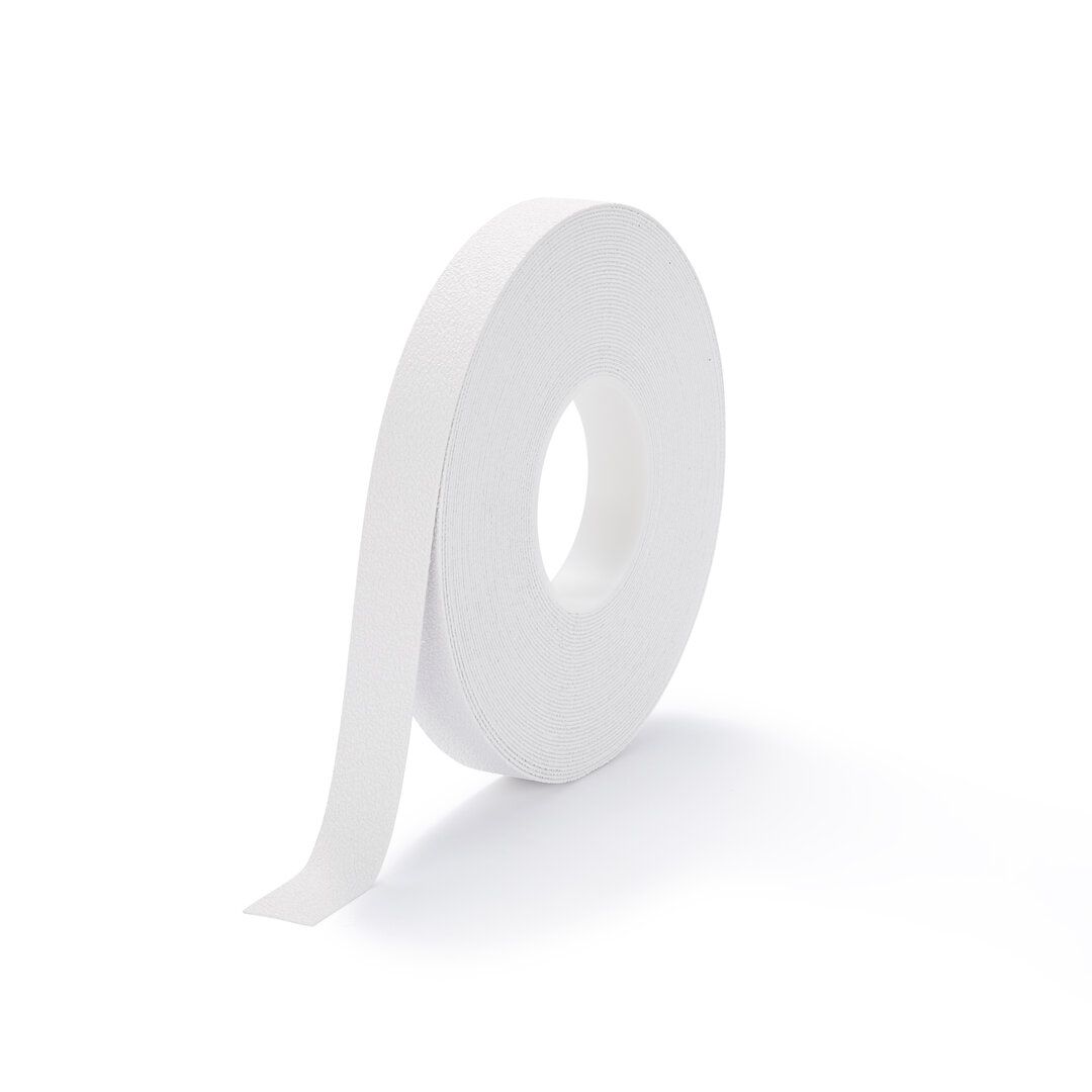 Bílá plastová voděodolná protiskluzová páska FLOMA Super Resilient - 18,3 m x 2,5 cm a tlo