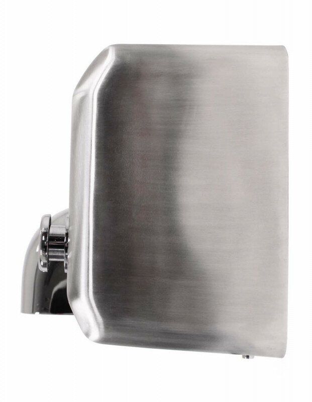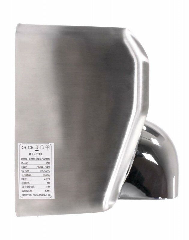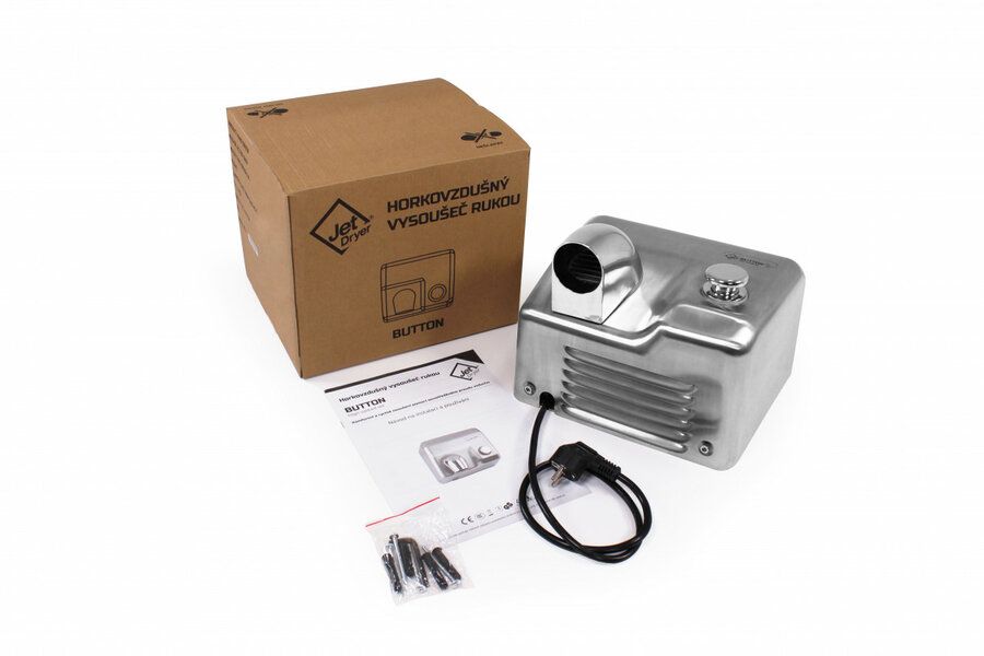 Tělo osoušeče Jet Dryer BUTTON je vyrobeno ze silného a velmi houževnatého kovu. Můžete si vybrat mezi provedením z lakovaného kovu nebo nerezové oceli. Kryt je fixován pomocí bezpečnostních šroubů. Pod osoušeč není možné nic zasunout a strhnout jej ze zdi.