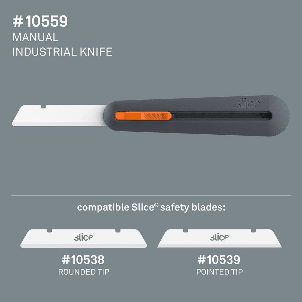 Polohovatelný průmyslový univerzální nůž Slice 10559 lze vysunout čepel o délce 7,6 centimetrů. Je určen pro řezání tlustých materiálů, jako je pěna, extrémně silná lepenka a izolace. Odolná pětistupňová rukojeť nabízí čtyři hloubky řezu pro nejrůznější práce v oblasti průmyslu. Jednotlivé polohy nabízejí následující hloubky řezu: 6 mm, 28 mm, 53 mm a 76 mm.