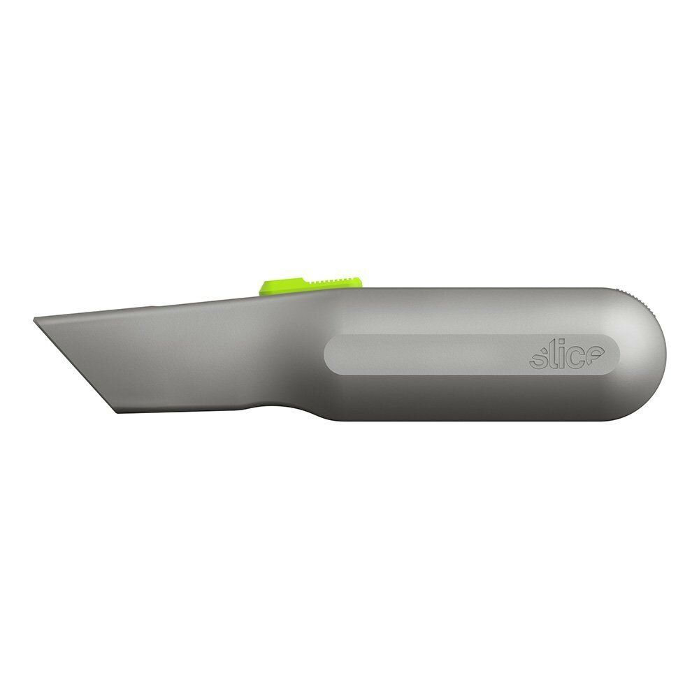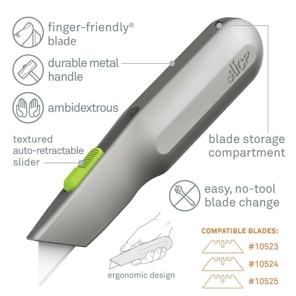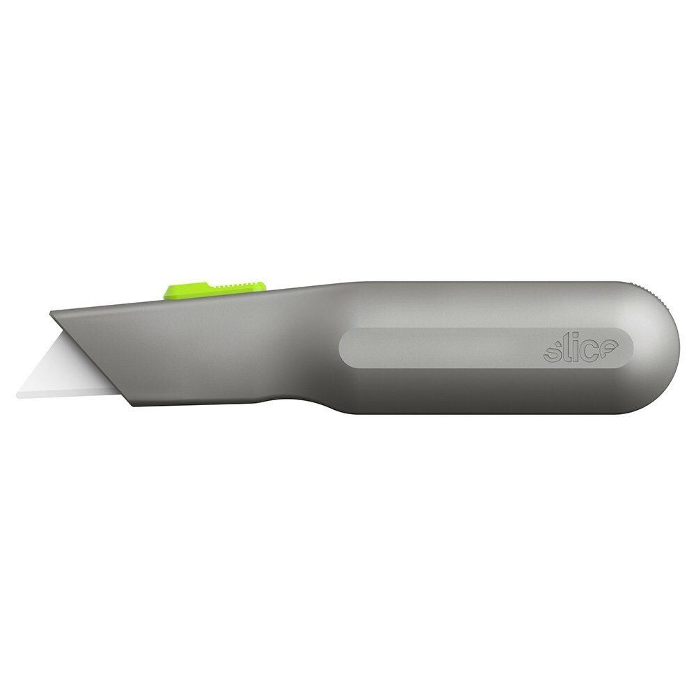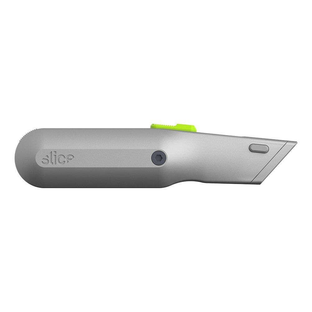 Samozatahovací univerzální nůž Slice 10491 kombinuje elegantní ale zároveň robustní kovovou rukojeť s patentovanou bezpečnostní čepelí pro výkonný a bezpečný nástroj. Dodáván je s čepelí, jenž se při uvolnění posuvníku automaticky zatáhne. Čímž se zajistí, že se ostří nikdy samovolně nevysune. V rukojeti nože je také zabudován vestavěný zásobník na náhradní čepele.
