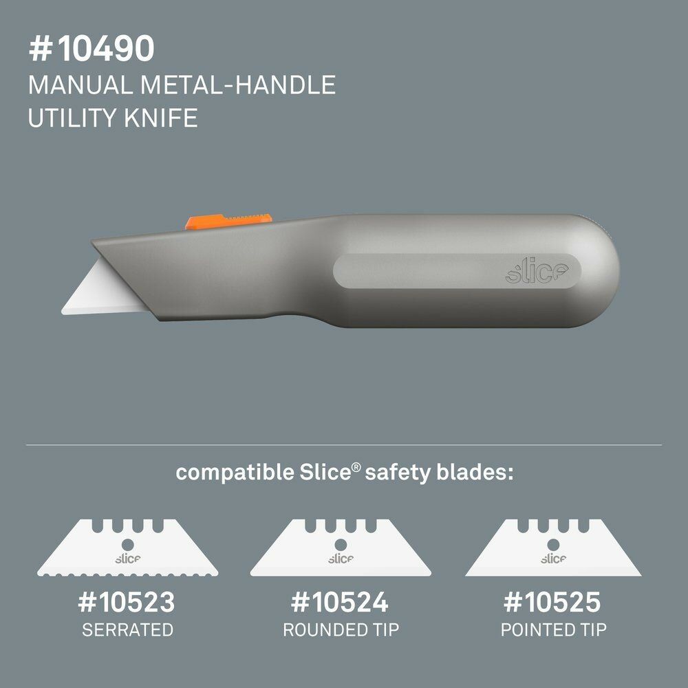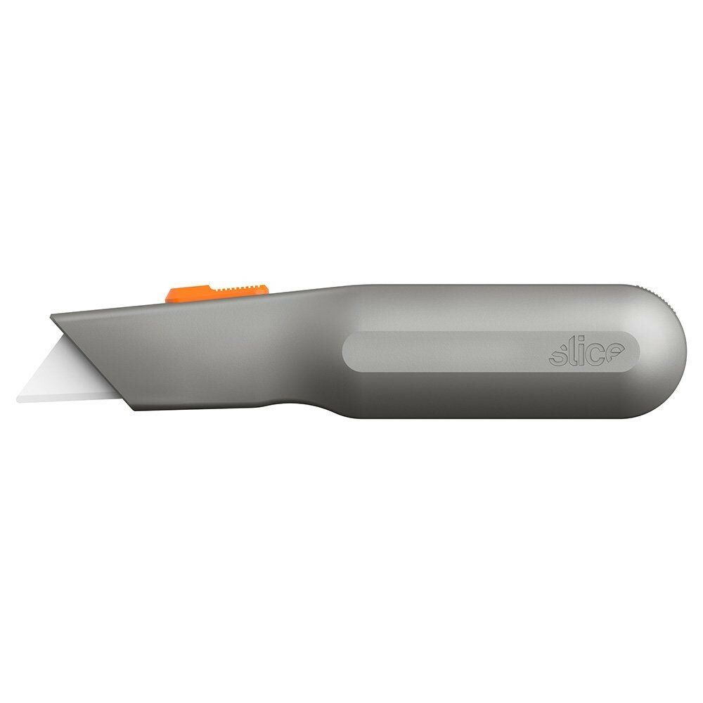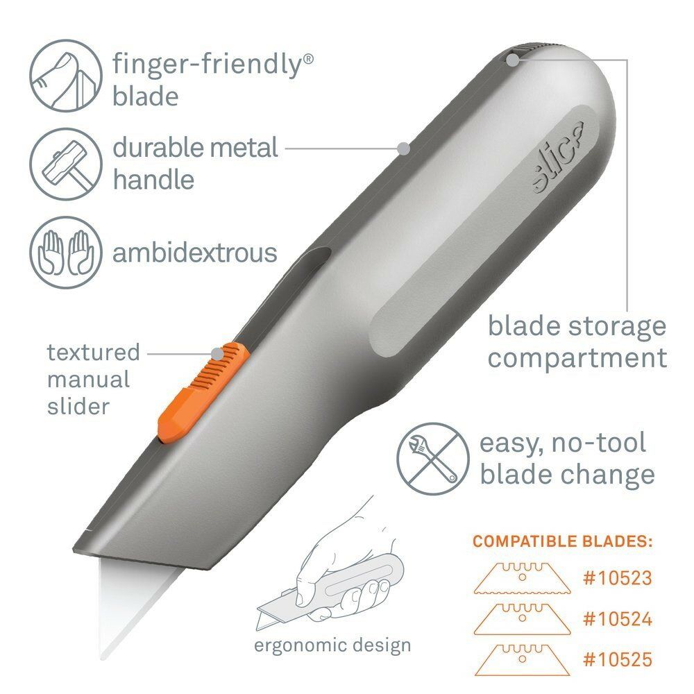 Polohovatelný univerzální nůž Slice 10490 s kovovou rukojetí, která je silná a pohodlná, připomíná tradiční nůž. Vyberte si tu nejbezpečnější délku čepele pro vaši práci díky nastavení tří různých hloubek řezu. Prodává se s tenkou, odolnou trapézovou čepelí a na zadní straně rukojeti je možné ukládat náhradní čepele do zásobníku.