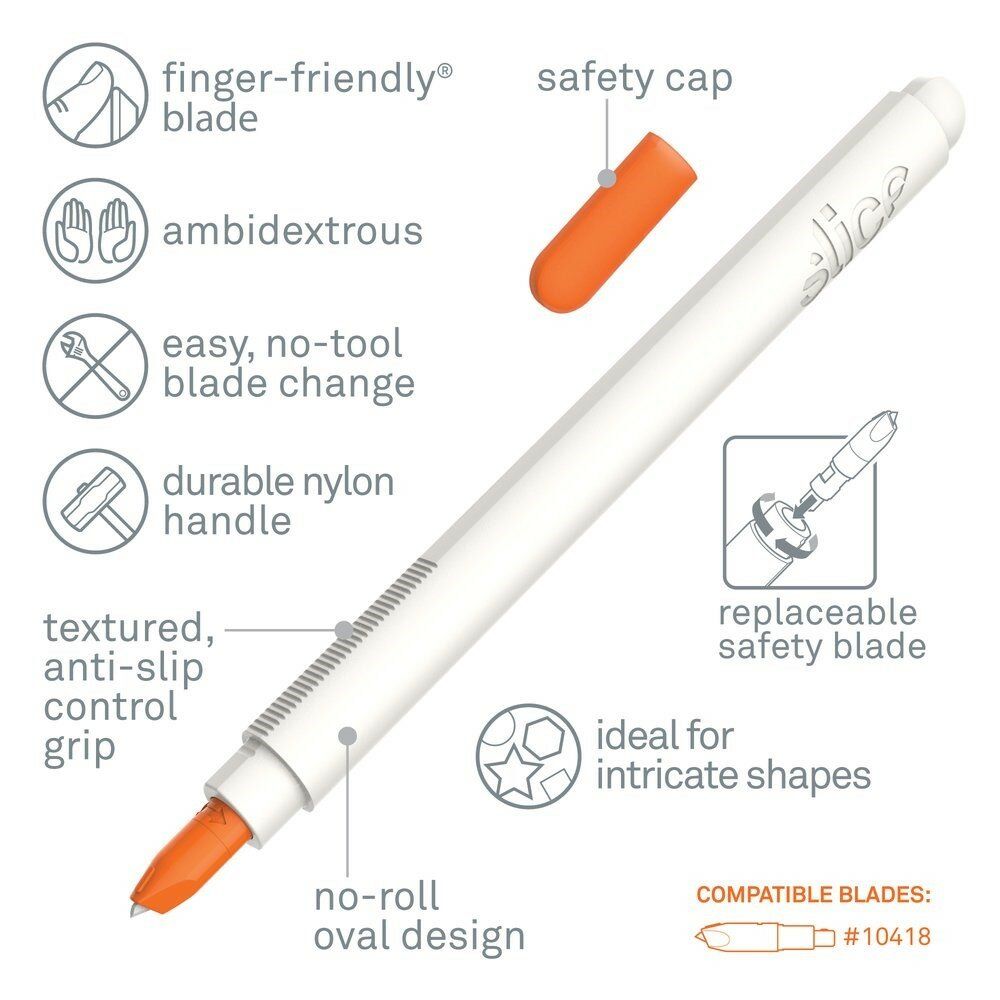 Přesný nůž Slice 10416 je aktualizovaná verze přesných nožů. A to díky novému designu rukojeti, který obsahuje no-roll pohodlný úchop pro lepší kontrolu. Odolná nylonová rukojeť se skleněnou výplní pojme naši vyměnitelnou patronu z mikro-keramiky SKU 10418, takže jakmile se první čepel otupí, můžete ji nahradit jednoduchým otočením a tahem - nepotřebujete žádné vnější nástroje. Ideální pro řezání papíru, vinylu a další tenkých materiálu.