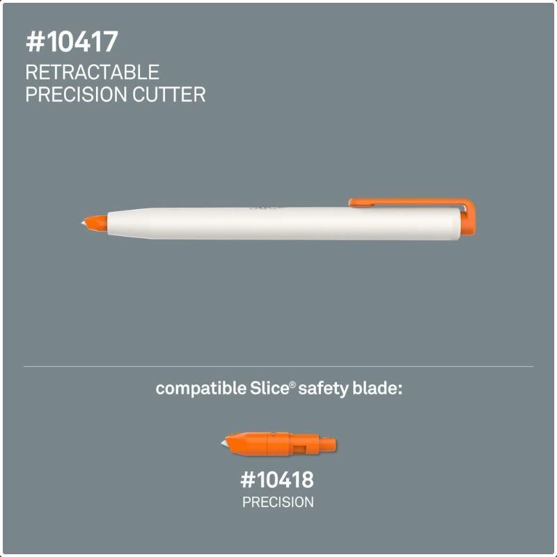 Zatahovací přesný nůž Slice 10417 se pyšní bezpečnou, efektivní, mikro-keramickou čepelí s naším unikátním finger-friendly zbroušením. Tento nůž je bezpečný na dotyk a díky své snadno ovladatelné rukojeti dokáže vyřezat i složité detaily do tenkých materiálů. Když dokončíte práci, můžete čepel jednoduše zatáhnout stisknutím tlačítka na konci skalpelu - jako u propisky. Díky svému designu lze nůž jednoduše připnout na vaši kapsu.
